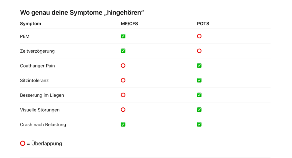 Auch am Computer sitzen ist für mich so viel anstrengender als etwa kurzes Gehen. Gehen ist bei mir für kurze Strecken oft besser möglich als Sitzen, da dabei die Muskelpumpe aktiv ist und der venöse Rückstrom unterstützt wird. Allerdings geht gehen auch nur kurze Strecken, wegen PEM, die am nächsten Tag folgt.
