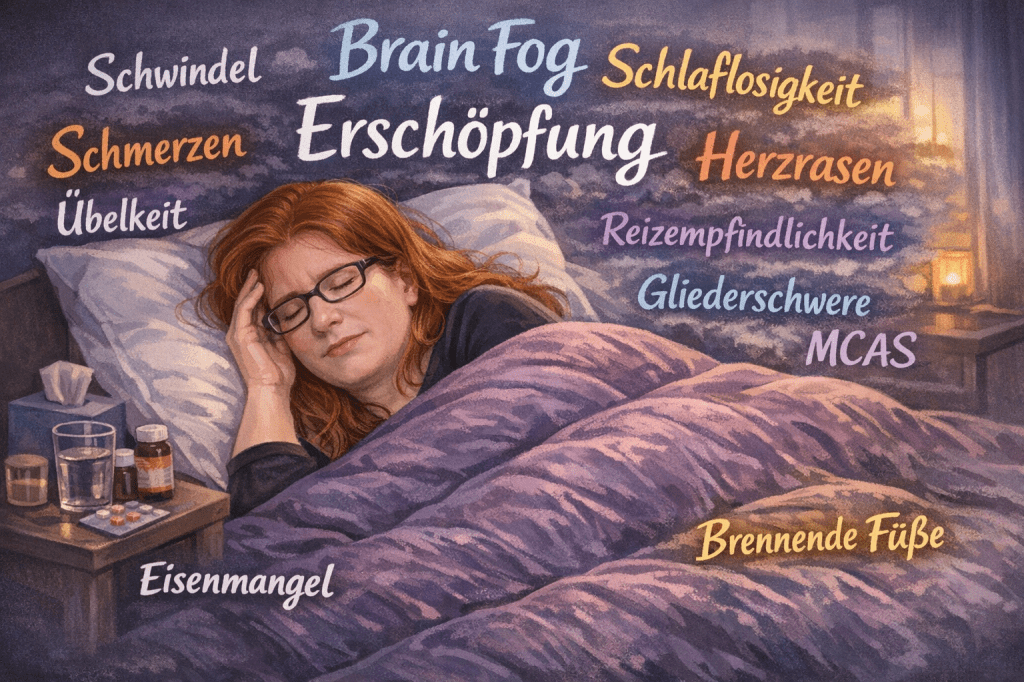 ME/CFS wird meistens mit Menschen bebildert, die im Bett liegen, sich die Hand vors Gesicht oder an den Kopf halten (ja genau, so ein Bild seht ihr oben), oder eine Augenmaske tragen. „Sie sind halt erschöpft“, weil „ME/CFS ist halt eine Erschöpfungskrankheit“, ist das, was sich viele bei solchen Bildern denken. Doch das greift viel zu kurz. Wir liegen nicht nur im Bett herum, weil wir erschöpft sind (oder etwa keinen Antrieb hätten, der ist da!), sondern oftmals steckt eine ausgeprägte autonome Dysfunktion (Dysautonomie) dahinter.