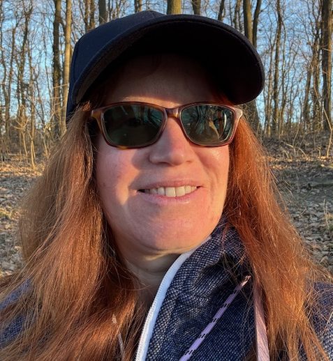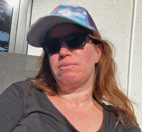 Wenn ihr genauer hinseht, seht ihr vielleicht auch Folgendes: Leicht gerötete Wangen (MCAS und Dysautonomie-Kombi), verschränkte, überkreuzte Beine (damit meine Orthostase halbwegs im Lot bleibt) sowie durchsichtige Ohrstöpsel (die störende Hintergrundgeräusche dämpfen) im Ohr, eine zu 80 Prozent verdunkelte Sonnenbrille (um den Lichtreiz zu dämpfen), eine Kappe am Kopf (ebenfalls gegen die Lichtreize).